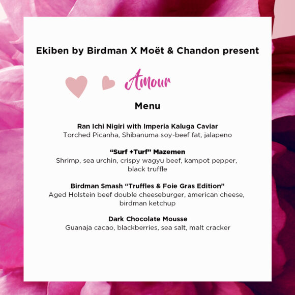Η Moët & Chandon, η πιο διάσημη σαμπάνια στον κόσμο, και ο Άρης Βεζενές, ένας από τους πιο καταξιωμένους Έλληνες σεφ, συνεργάζονται και δημιουργούν ένα μοναδικό tailor – made μενού στο εστιατόριο Ekiben by Birdman με αφορμή τη γιορτή του Αγίου Βαλεντίνου.