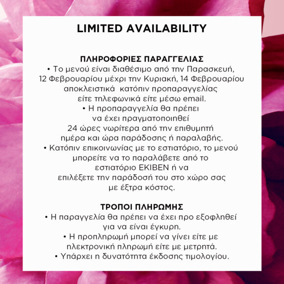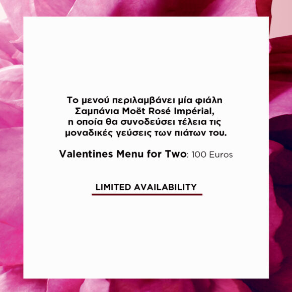Το μενού είναι σχεδιασμένο από τον Άρη Βεζενέ ειδικά για at-home dining experience lovers και περιλαμβάνει μοναδικά πιάτα σε ένα εξαιρετικό packaging το οποίο θα σας παραδοθεί μέσα από το premium delivery service by Moet & Chandon. Το μενού είναι διαθέσιμο για τις 12,13 & 14 Φεβρουαρίου κατόπιν προ παραγγελίας.